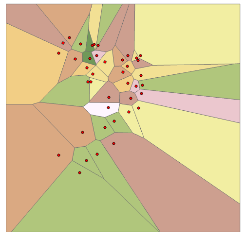 The first technique I explored was the Thiessen technique. This interpolation technique assigns an interpolated value equal to the value found at the nearest sample point. It is widely used because it is easy to create, use and interpret. In fact, no GIS software is required for the creation of the polygons. The results in this lab analysis indicate that the statistics generated from the Thiessen technique are almost the same as non-spatial techniques. However, the Thiessen technique creates a series of polygons with oddly shaped boundaries and abrupt transitions as seen in the image below. The resulting surface may not show well defined boundaries of a specific area. In fact, in this lab, the resulting surface was square, which is not representative of the boundary of the sample area and would have to be clipped to the area of study for a map. This technique would not be suitable for continuous variables as gradual changes in data would not be represented.